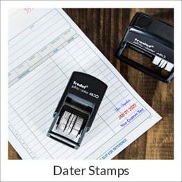 - Date Stamps: Dater stamps and numberers feature an easily adjustable band for simplified stamping. This stamp type is perfect for quickly and easily adding the date to all of your professional paperwork. Choose from professional daters with custom features like personalized text or your signature.